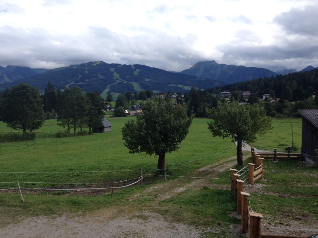 Looking down into the valley of Ramsau. The Guttenberg Haus, a mountain rest stop where you can get lunch and beer in foreground. In the background you can see the Schladming ski area, home of the 2013 alpine ski world championships as well as according to my uncle Steve the fastest downhill course he ever raced during his racing career.